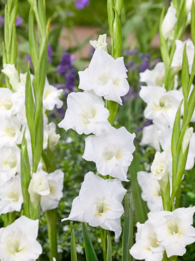 Gladiolus ‘Argenta’ on peen gladioolisort, mida imetletakse oma elegantsete pehmete hõbevalgete ja peene läikega õitega.