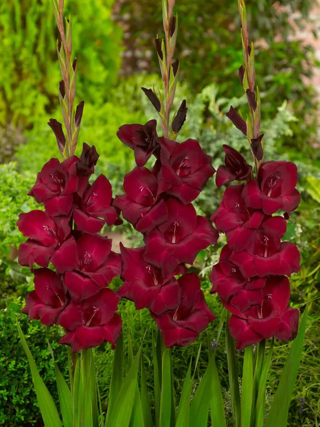 Gladiolus ‘At Night’ on dramaatiline gladiool, mille kõrged sügavburgundiapunased õied on kaunistatud sametise viimistlusega.