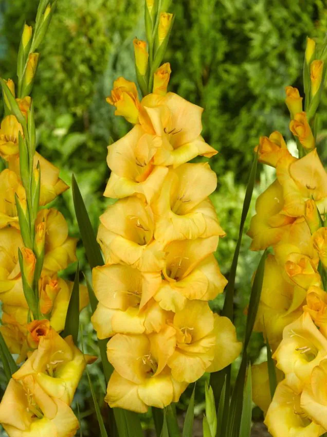 Gladiolus ‘Strong Gold’ on pilkupüüdev gladioolisort, millel on erksad kuldkollased trompetikujulised õied piklike püstiste võrsete ääres. Gladioolide gruppi kuuluv kultivar on hinnatud oma erksa värvuse, tugevate varte ja usaldusväärse suvise õitsemise poolest, mistõttu sobib see ideaalselt ääristesse, maamajade aedadesse ja lõikelilleseadetesse. Kõrged ja tugevad varred kannavad mitmeid õisi, mis avanevad järk-järgult alusest ülespoole, luues kauakestva ja pilkupüüdva kujunduse. Kuldkollased kroonlehed toovad aiapeenardesse, ääristesse ja kimpudesse soojust, rõõmsameelsust ja visuaalset efekti, muutes selle gladiooli suurepäraseks valikuks suviseks istutamiseks. Gladiolus ‘Strong Gold’ edeneb täispäikeses ja hästi kuivendatud, viljakas pinnases, andes minimaalse hooldusega rikkalikke õisi. Regulaarne lõikamine soodustab jätkuvat õitsemist, võimaldades erksaid õisi nautida nii toas kui ka õues. Õitsedes suve keskpaigast lõpuni, pakub see gladiool usaldusväärset värvi ja suvist võlu. Ideaalne nii aiandushuvilistele, lillepoodidele kui ka maastikukujundajatele, Gladiolus ‘Strong Gold’ ühendab endas erkkollase värvuse, elegantsed õievõrsed ja mitmekülgse dekoratiivse väärtuse. Lisa see julge gladiool oma aiapeenardele, ääristele või lõikeaedadesse, et näidata energiat, elujõudu ja suvist ilu kogu hooajaks.